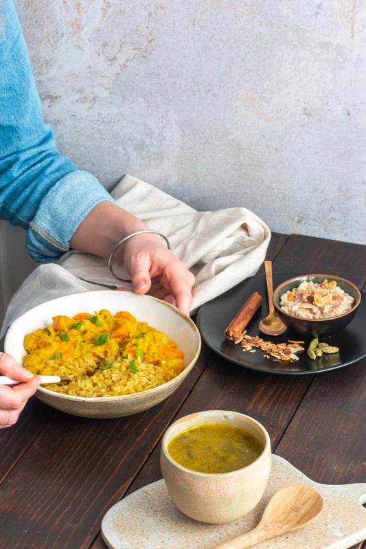Le menu s’adapte toujours. Je te propose un menu de départ en fonction de tes besoins (post partum immédiat ou non, post op etc). On l’adapte ensuite ensemble autant que nécessaire, jusqu’à ce qu’il te convienne. Cela fait partie des valeurs de Curcumamas